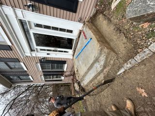 We removed the existing stoop and steps entirely, exposing the underlying base so elevations could be corrected. This phase allowed us to reset the structure properly and ensure the new entry would be square, level, and aligned with the front door and surrounding hardscape.