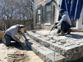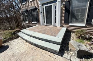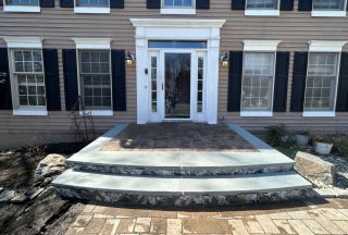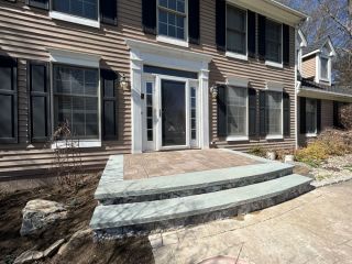 With the old structure removed, we rebuilt the entry using new stone block risers to establish consistent step heights and clean lines. Bluestone treads and landing pieces were then installed, creating a strong visual frame around the front door while tying into the existing walkway materials.