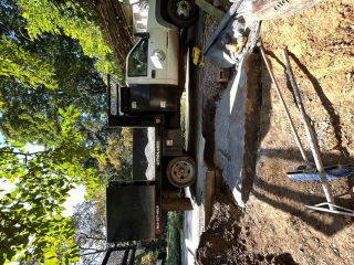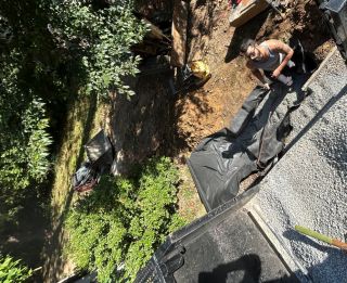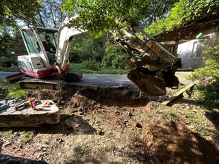 Once the material was on site, we carved into the hill and built a stable foundation using compacted aggregate and geo-fabric. With stone this size, you don’t place it — you persuade it into position. Every adjustment is done with the machine, then fine-tuned by hand so it sits level, drains correctly, and locks cleanly into the grade.